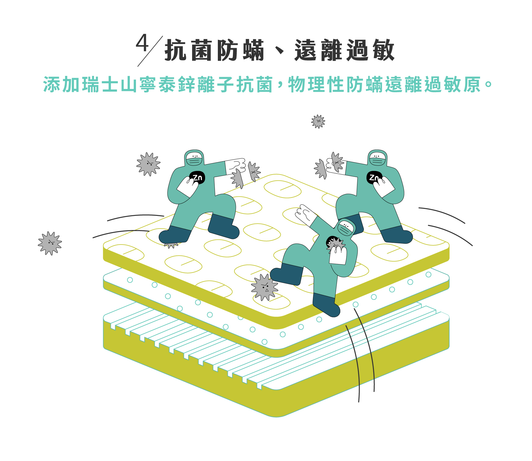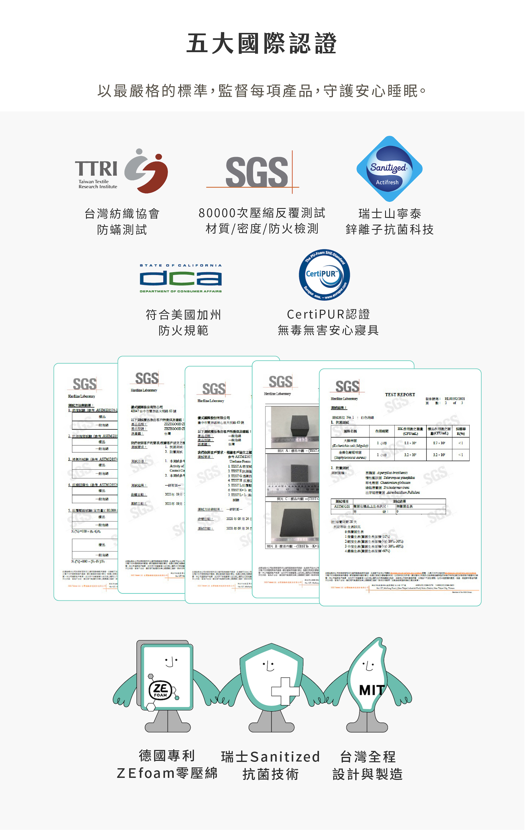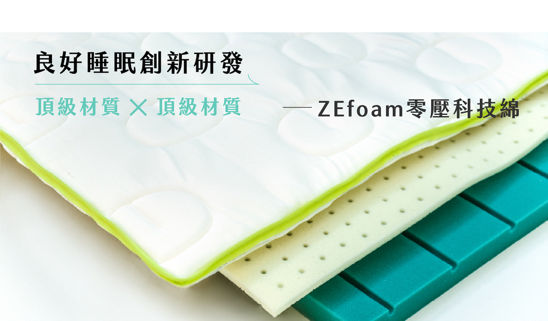 研發團隊針對各項材質分析、打樣與測試,嚴選最高等級德國Bayer Bayfit & Desmodur 專利材質- ZEfoam 零壓科技綿,打造絕佳釋壓性與低反彈的舒適躺感。