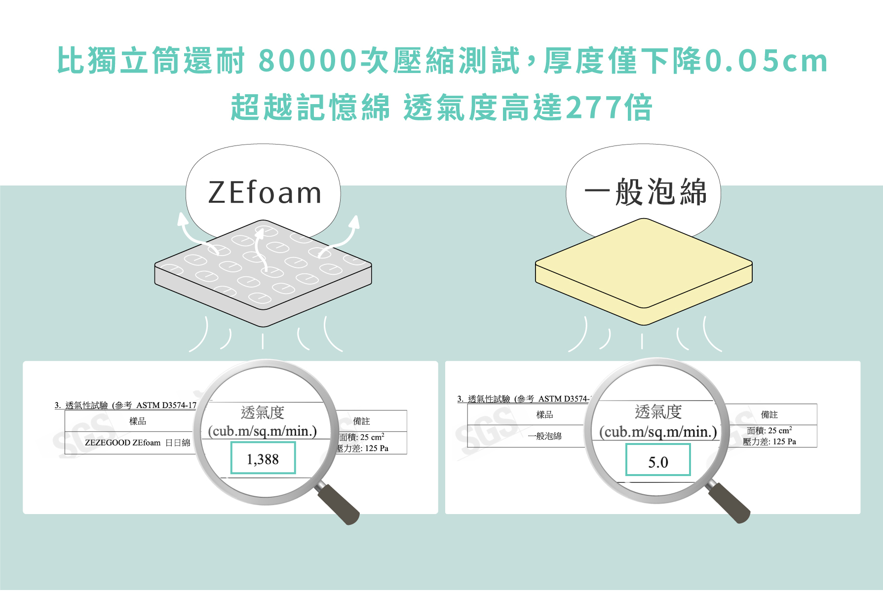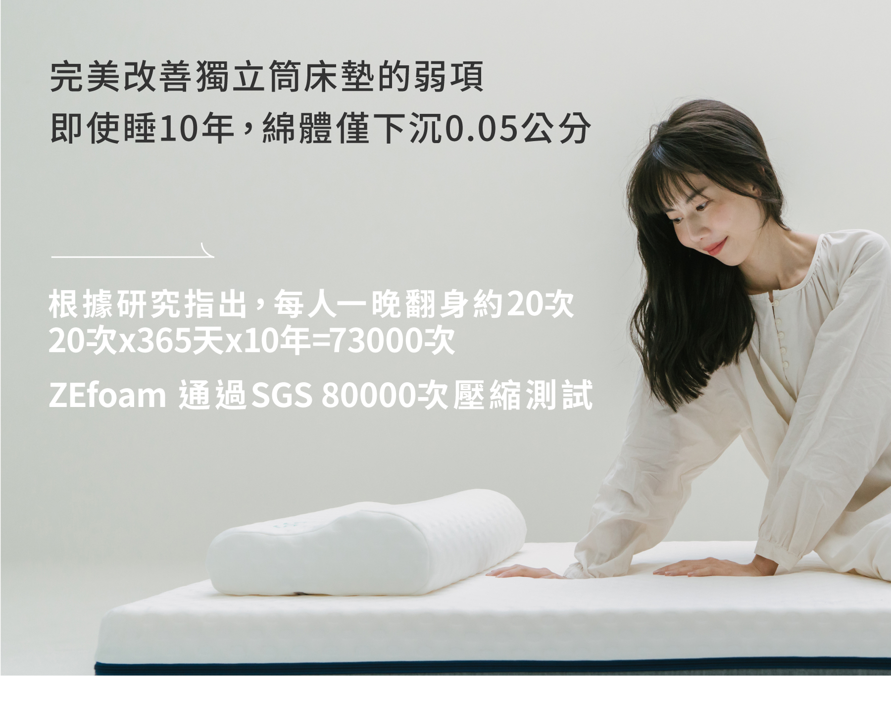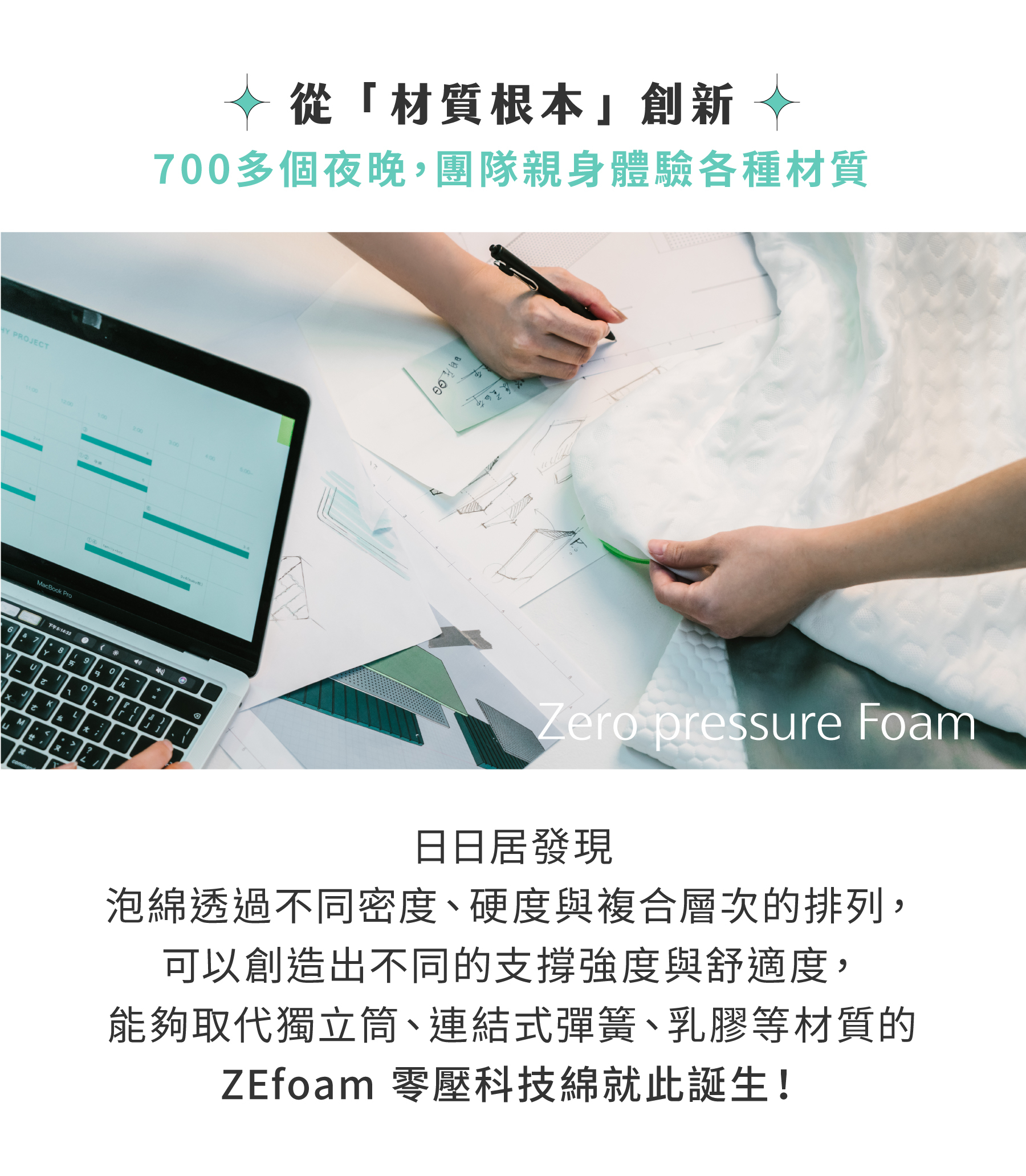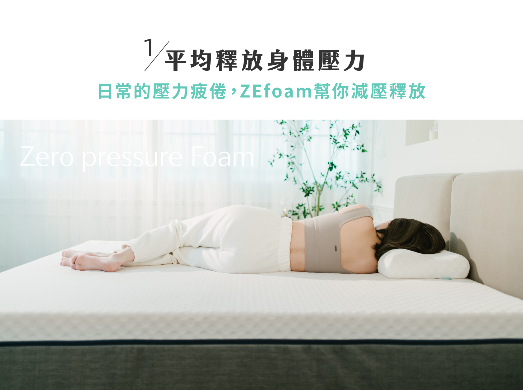 研發團隊針對各項材質分析、打樣與測試,嚴選最高等級德國Bayer Bayfit & Desmodur 專利材質- ZEfoam 零壓科技綿,打造絕佳釋壓性與低反彈的舒適躺感。